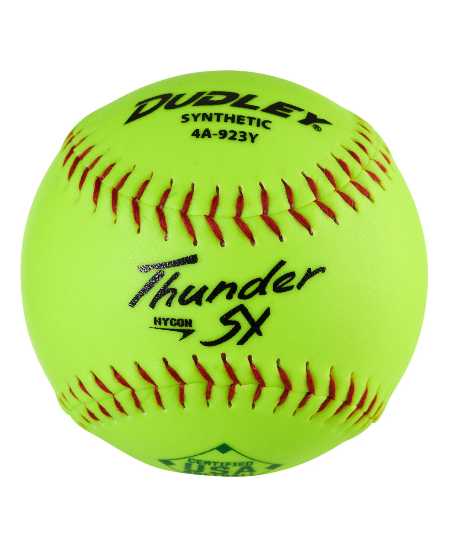 The 11″ Thunder SY Hycon softball has a synthetic yellow cover, polyurethane core, and is USA Stamped and Approved. This ball is sold by the dozen (12 balls) and ships free!